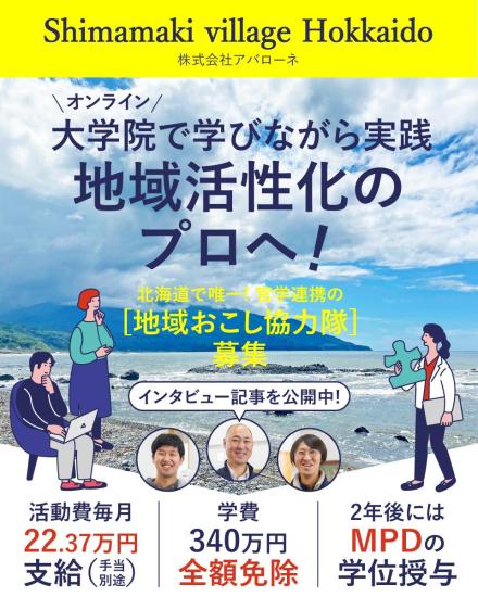 島牧村現場が最高の教科書。日本初「院生兼協力隊」で島牧村を動かせ!20251225島牧村地域おこし協力隊の募集詳細は「ジョブキタ」にて! <掲載期間:2025/12/22(月)6:00〜2026/2/2(月)6:00> 海と山の絶景!北海道島牧村で叶える理想の暮らし 北海道…