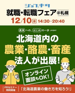 北海道ジョブキタ就職・転職フェアに、北海道内各地から農業法人が集結!20251117北海道で働きたい人のための行動企業説明会「ジョブキタ転職・就職フェア」。北海道内各地の企業の採用担当者と直接話せる・質問できる転職者向けのイベントです。前職経験を活かせる職場や興味がある企業はもちろん…